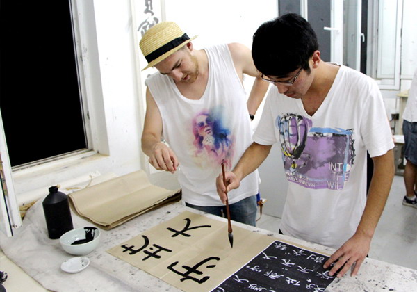 随后,周老师挥舞笔墨,给我们演示了秀丽端庄的小楷,端正雄厚的篆书。留学生也按耐不住,跃跃欲试,周老师让自己学生带领留学生进行书法练习,周老师一个一个进行指导。为留学生讲解书写的技巧,运笔时应该注意的轻重缓急,如何的圆滑且刚劲有力,留学生认真的听取学习,耐心的练习,一撇一捺,交流中表现出火热的激情。