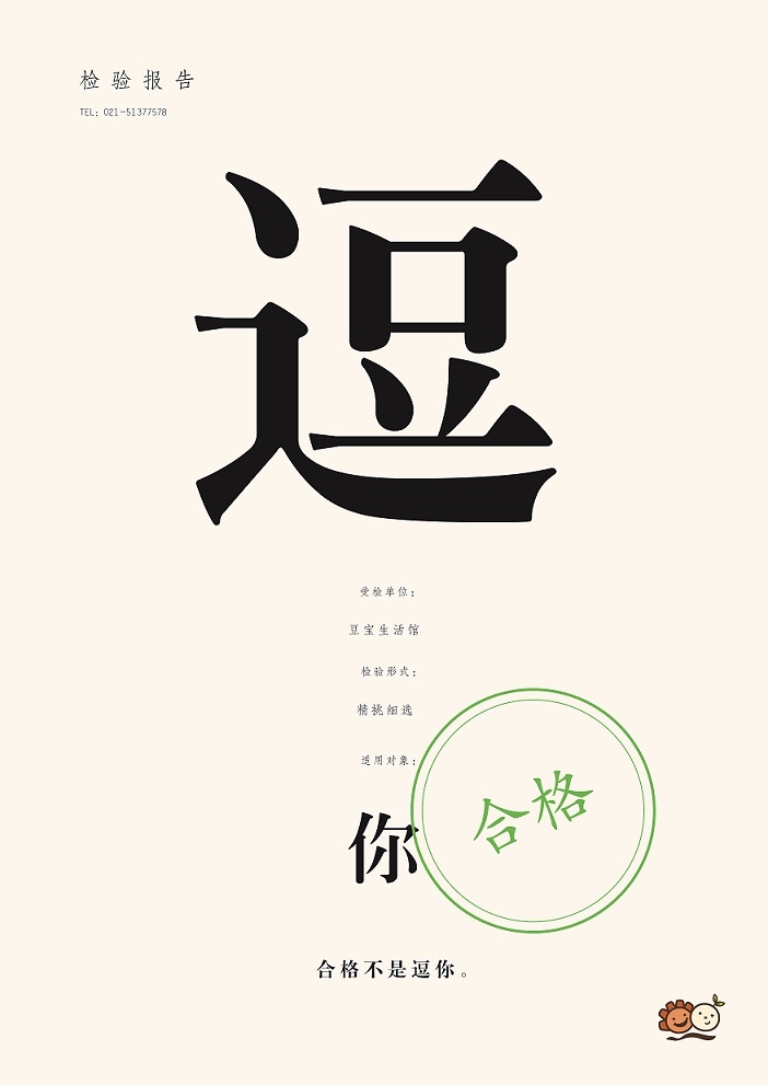 “这幅作品是在截稿的早晨才创作出来的,虽然我们之前想过很多的方案,但是实际效果并不理想,突然想到利用文字来实行创意,一个食品最核心的就是产品合格,我们想到利用产品合格鉴定表来完成画面,先是确定了合格不是逗你的广告语,豆与逗做了一个替换,与本身豆宝生活馆的主题相吻合,然后将一些双方有相通的元素进行添加,进行细节的设计与调整,最后做出了这样的视觉效果。”