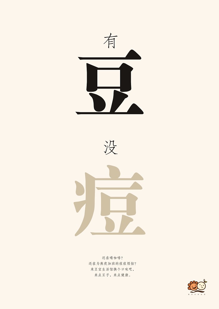 “现代都市的上班族普遍工作压力较大,因此身体也会出现一些问题,而豆宝生活馆就是为了缓解上班族的压力而创建的一个场所,根据这一点,我们想到了‘有豆没痘’这句广告语,很通俗易懂的文字,加上整体画面没有其他内容,纯文字的效果更能够让消费者在第一时间明白豆宝生活馆的营销理念。在文字的颜色的上,我们也做了一点变化,突出‘豆’,也就是突出豆宝生活馆。整体的呈现简明但不简单的画面效果。”