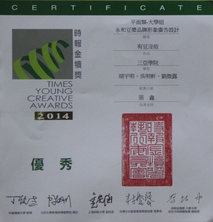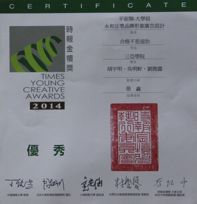 艺术学院党总支副书记、视觉传达专业教师张鑫带领胡宇明、吴明轩、刘微露三名学生,参加金犊奖大学组平面类的比赛,选定主题“永和豆浆品牌形象广告设计”,作品《有豆没逗》、《合格不是逗你》获得优秀奖。张鑫老师十分注重学生设计思维的培养,让学生在动手动脑的过程中体会设计的乐趣,获得设计的灵感,带领学生多次摘得金犊奖项,张鑫老师也连续多年被授予金犊奖特约推广人。
