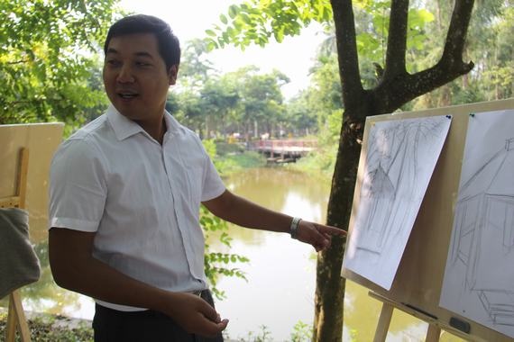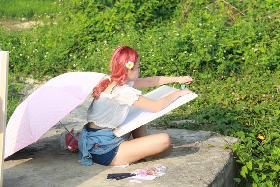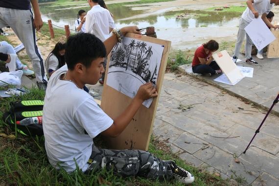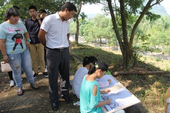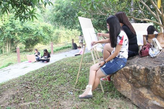 金色的光束透过树木散落在大地上,清爽的微风缓缓的拂过,静谧的白鹭溪旁,有一群背着画板画架、提着画材的同学们,他们正是艺术学院14级的学子们,他们朝气蓬勃,充满活力。