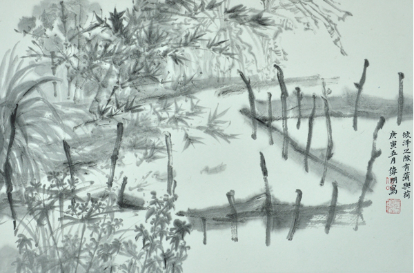 中国画从题材上大致可分为;山水画、人物画、花鸟画。从画法上大概可分为;写意、工笔、没(音同莫)骨。其中山水画从设色上可分:金碧山水、青绿山水、浅绛山水、水墨山水。从章法布局上可分为;全景山水、小景山水。这一期的五张画就是水墨小景山水。在生宣上面只用水墨来描绘池塘一角,田地一隅。