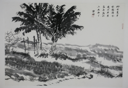三罗村往西是封塘村。封塘村的地头有好多这样的小棚架,可能是瓜农看瓜的棚子吧。矮矮的椰子树枝叶纷披,不用重墨不足以表达那种浓浓的生机。沟壑上闲散的野草歪七扭八,自在的表达着它对生命的理解。题款想用《诗经》里面的“野有蔓草,零露漙兮',后来想;还是“大田多稼,既种既戒,及备乃事”比较贴切。