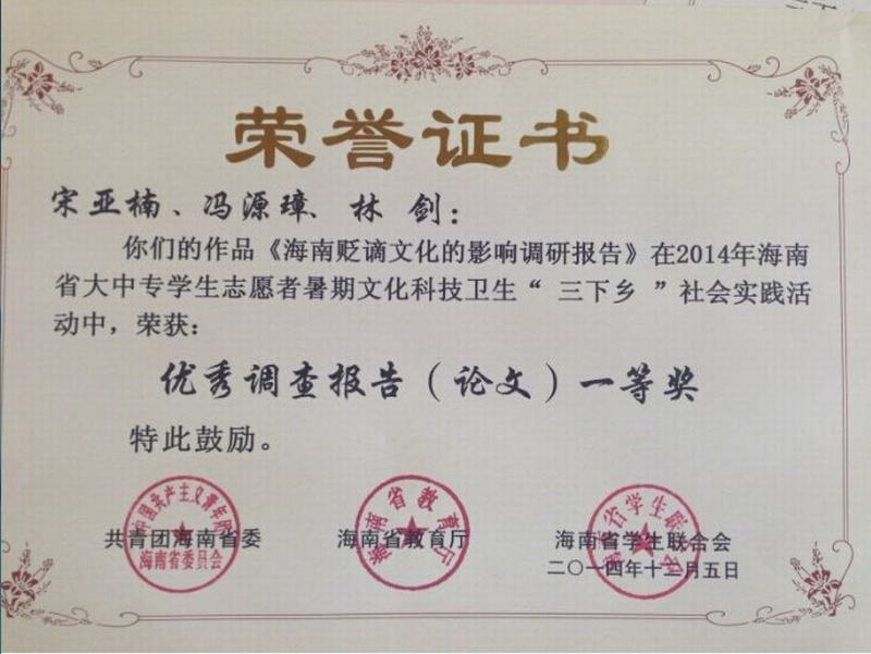 艺术概论教学,坚持把哲学理论用通俗的语言表述出来。一方面使学生能从哲学的高度明确艺术概论中的基本理论;另一方面用作为通识课使更多的学生建立起爱的精神家园。为了能使更多的非艺术类的学生也能受到艺术教育,顺利地建成自己的精神家园,懂得生命的意义,善于调动学生学习的积极性,引导学生认识到只有学习、探索、奋斗才能焕发生命的光彩。这是应财经学院13级邀请,与之共同完成《海南贬谪文化对后世的影响》调查报告,并获得海南省暑期三下乡社会实践论文一等奖。在这次活动中增强了师生之间的情感,有了新的生命的感悟。