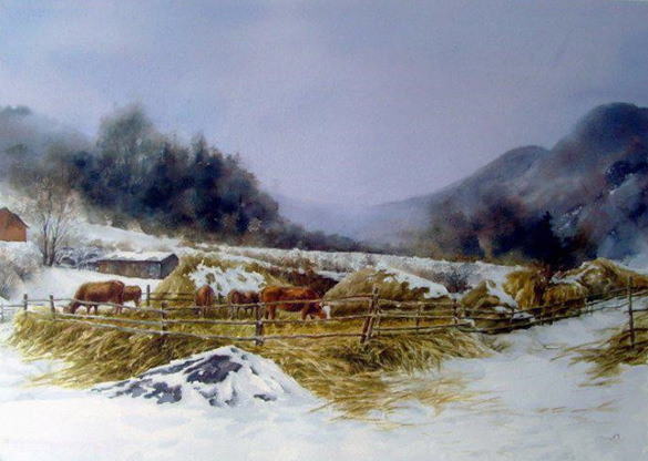 赵生国的作品多以描写家乡田园风光和雪景为主。