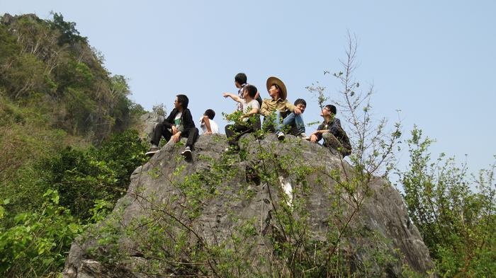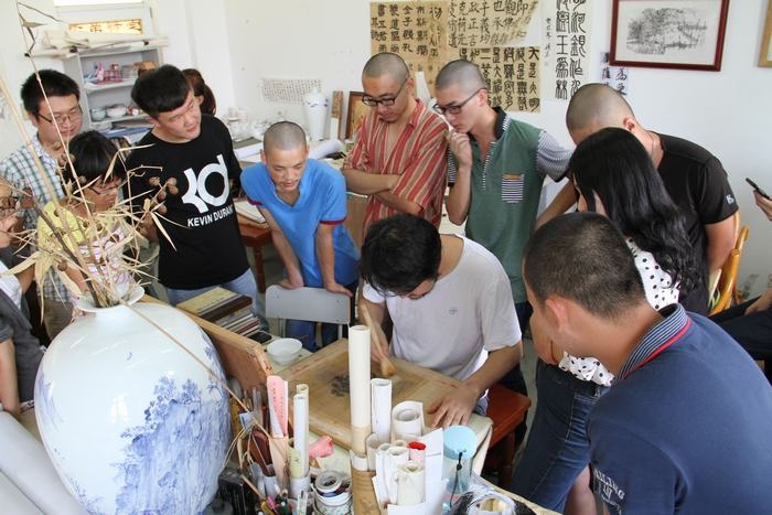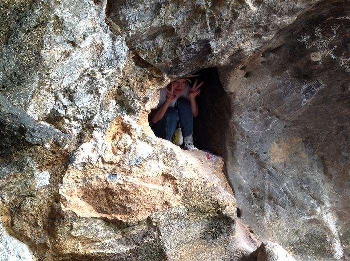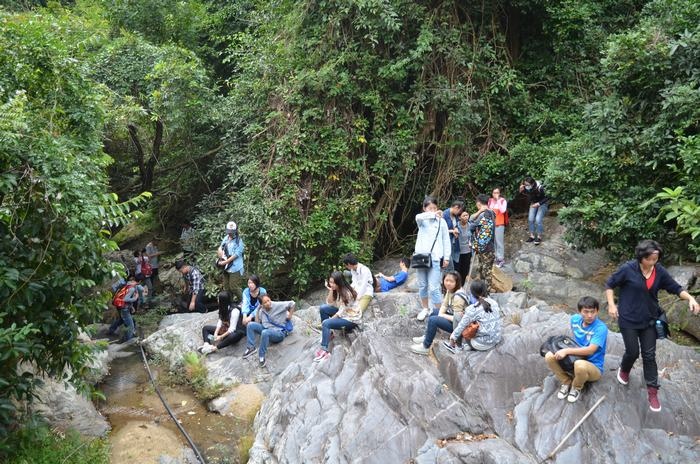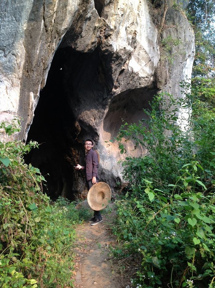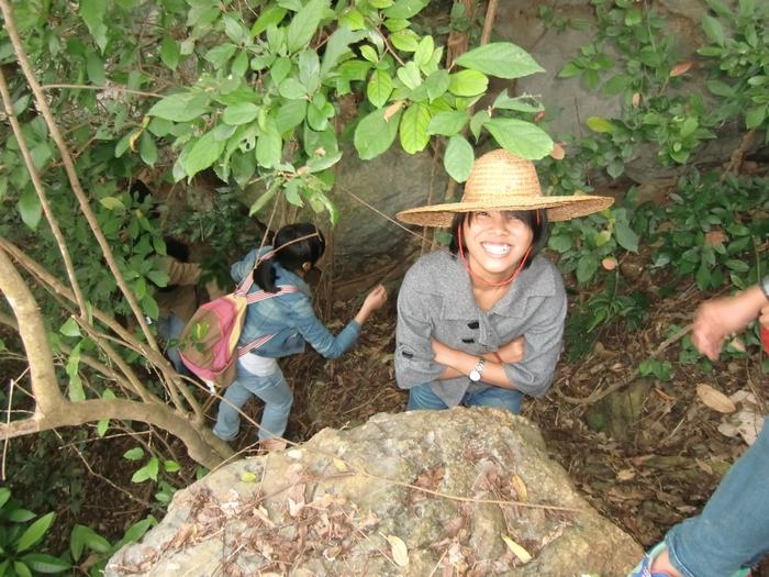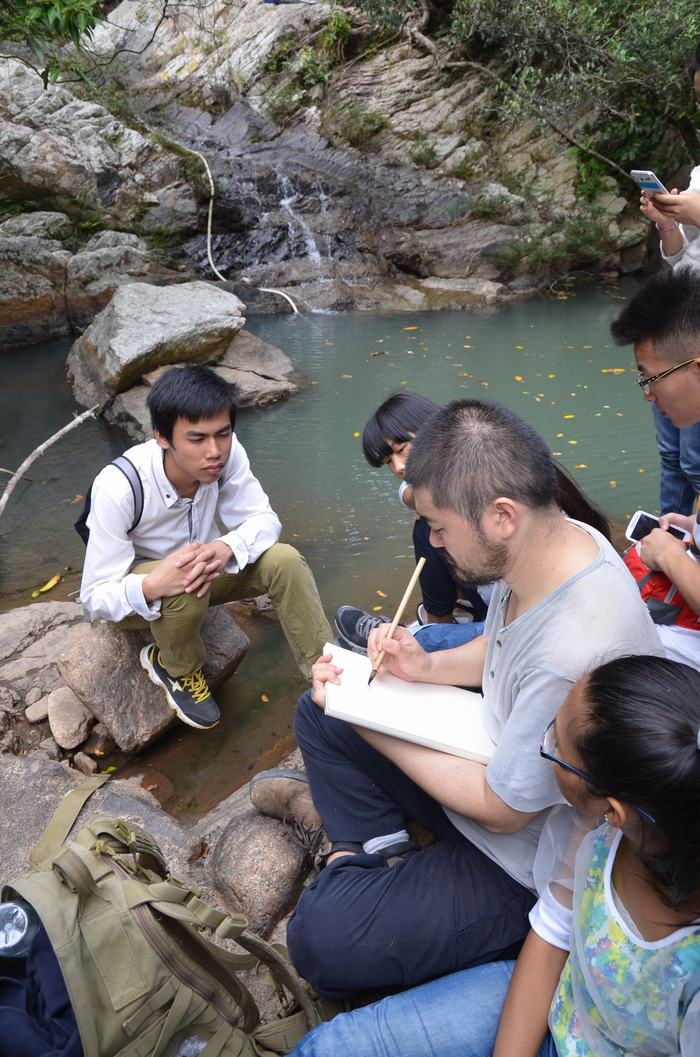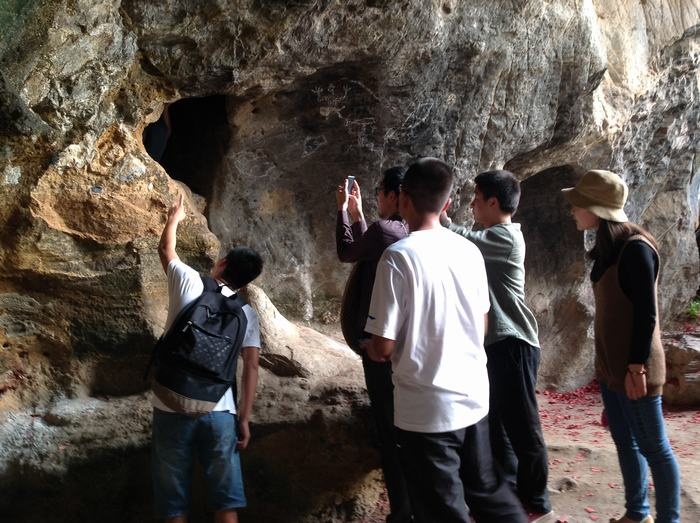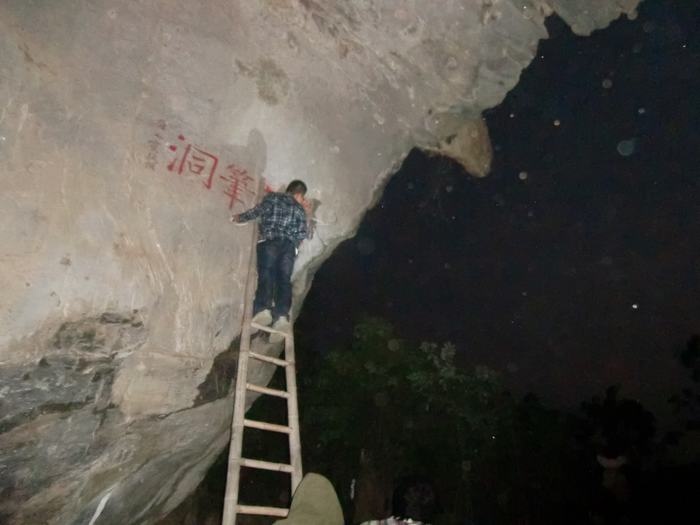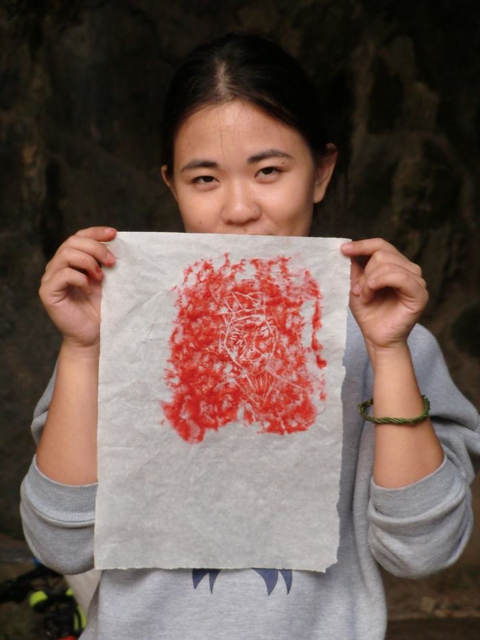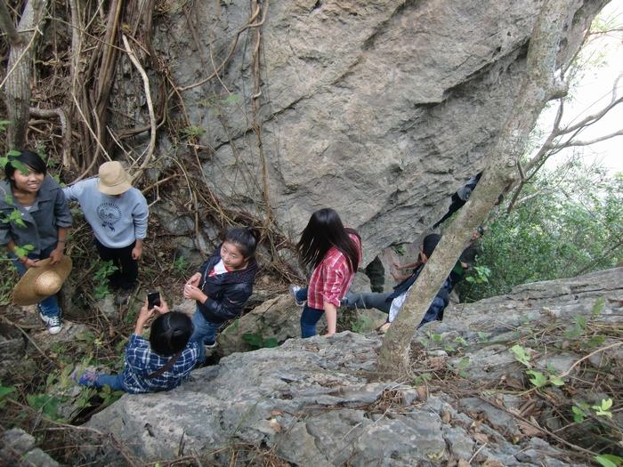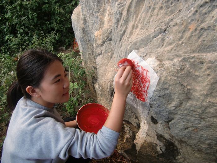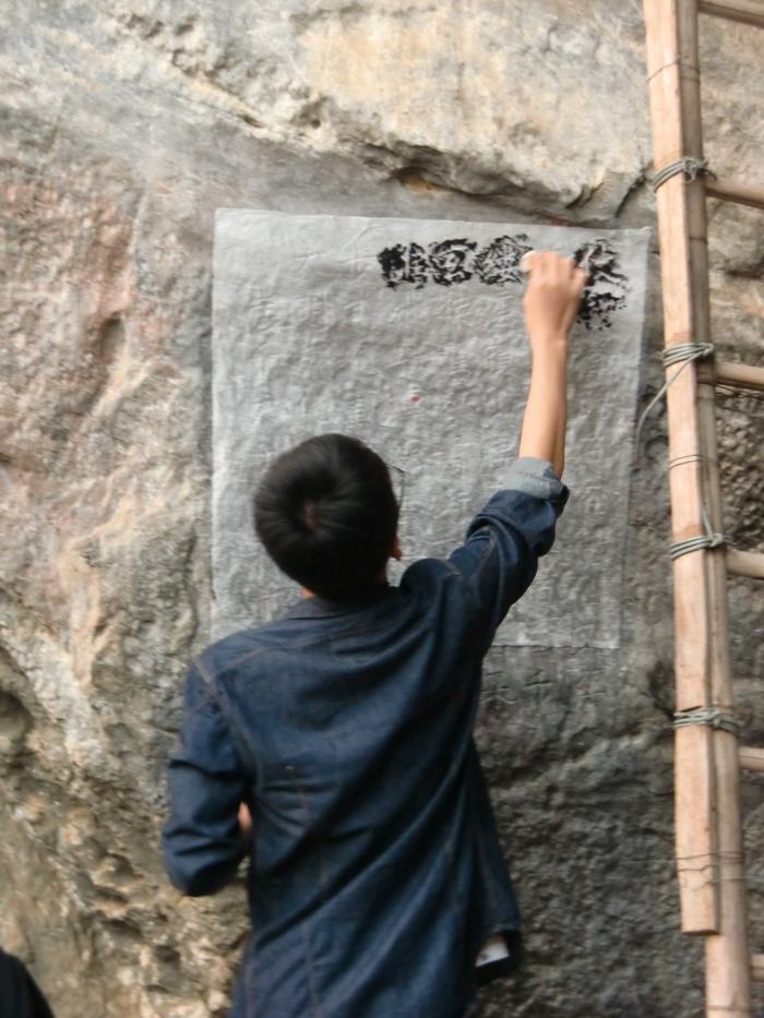 考察学校附近落笔洞元代碑刻,并制作拓片。煮白芨水,做拓包,研朱砂墨、松烟墨,闷纸。