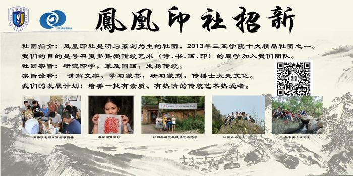 三亚学院书法社团成立于二零零五年,是学校成立的第一批社团,到今天注册社员已经达千人。全学院的同学都可以利用业余时间来学习书法,体悟传统。社团里每周一次的活动内容极丰富;书法、篆刻、绘画、写生、做拓片、看展览。一个学期下来,既学了传统书法绘画,又认识了好多不同专业的同学,丰富了大学生活。