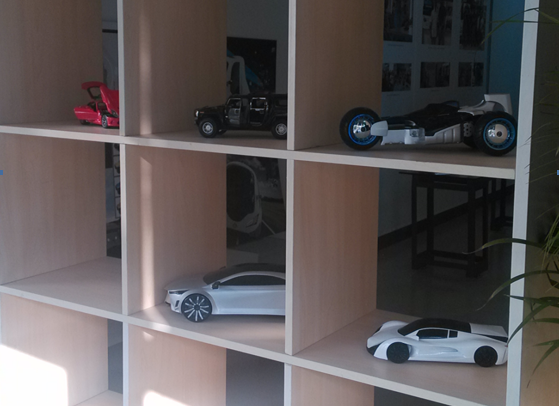 左手边是陈列架,陈列有往届优秀毕业生的设计作品、各类专业图书以及经典车型展示。在这里,与经典名车的零距离接触,通过触摸、观察,能够更深入的体会课本中的理论内容,让课堂不再枯燥。