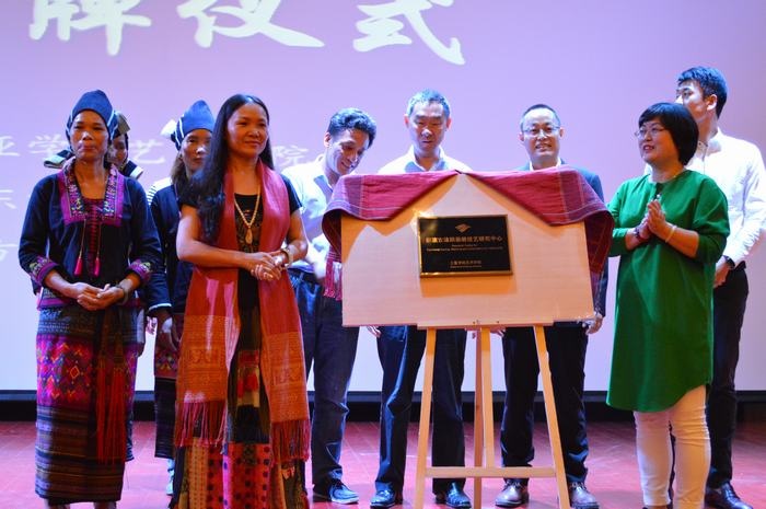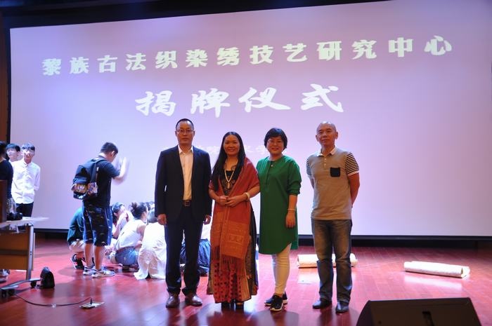 10月21日下午,在书山馆报告厅,隆重举行了三亚学院艺术学院、东方市文化馆“黎族古法织染绣技艺研究中心”揭牌仪式。东方市文化馆副馆长王秀蓉女士,黎锦古法染色技艺传承人符现相、符会三、符永英女士应邀出席。