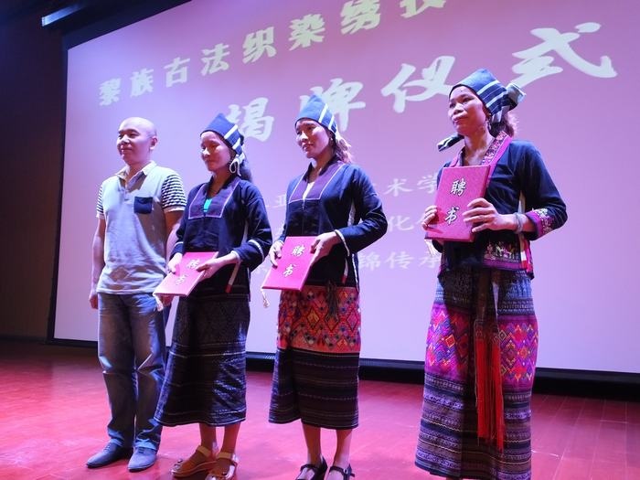 随着揭牌仪式的结束,“黎族古法织染绣技艺研究中心”正式成立,由艺术学院服装与服饰设计专业主任杨洋老师担任中心主任,聘请东方市文化馆副馆长王秀蓉女士担任副主任,并现场颁发聘书,同时聘请王秀蓉女士担任艺术学院专家顾问,聘请黎锦古法染色技艺传承人符现相、符会三、符永英为艺术学院服装与服饰设计专业实验室工艺导师。