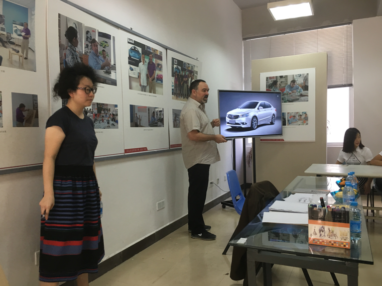 12月22日上午,在汽车创新实验中心,GuyBurgoyne与产品设计和汽车造型设计学生在艺术学院汽车创意实验室展开互动交流。Guy Burgoyne针对吉利瑞博的设计过程,向学生们详细讲述了他的设计观念,并分享了他从事设计师行业的经验。
