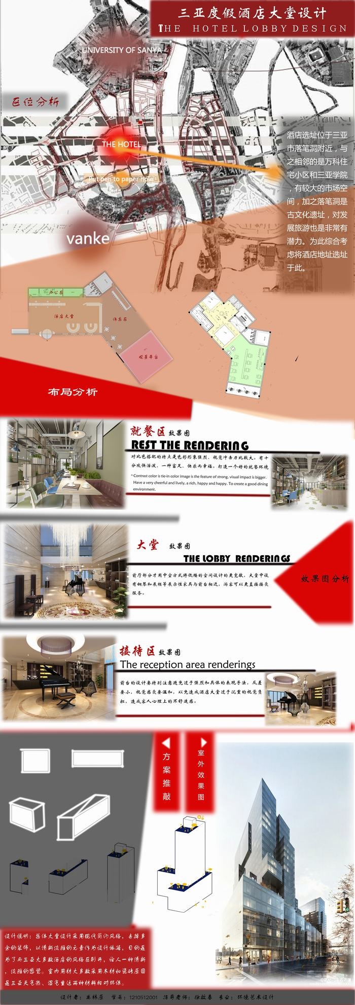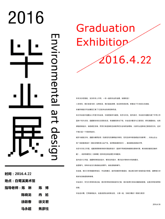 本届环境设计专业展览汇集了12级环艺122位毕业生的作品。分为白鹭溪展厅和环艺专业分展馆,毕业设计选题从工作室方向出发。分别是城市与建筑,生态与文化,室内设计。