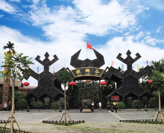 槟榔谷大门景区位于甘什岭自然保护区内,两边森林茂密,中间是一条连绵数公里的槟榔谷地,故称槟榔谷。景区由原甘什黎村、苗族狩猎文化区、大型原生态黎苗歌舞《槟榔•古韵》三大版块组成,是海南省游客满意十佳景区和十大最佳特色魅力旅游风景区之一,是海南省最丰富、最权威、最灵动、最纯正的民族文化“活体”博物馆。