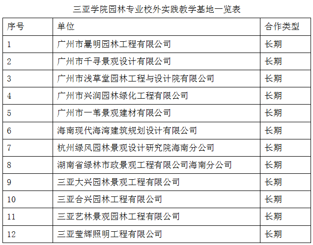 园林专业目前与广州、杭州、湖南、海南等地的12家校外实习基地合作,开展关于园林工程预算、景观设计、园林施工、园林苗木管理等相关课程的教学实习工作。这些实习单位每年为园林专业学生提供定期定量的实习机会以及毕业实习职位,有很多毕业生选择留在这些公司继续工作。