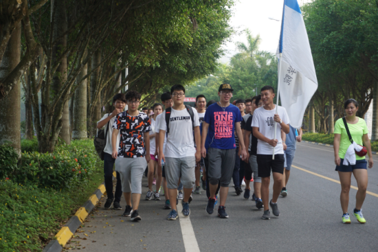 这次的徒步活动不仅仅是为了锻炼我们同学们的意志,更是为了缅怀红军长征胜利80年,让同学们体验革命先烈精神而举办的。“徒步30公里活动正式开幕!”张鑫书记的话音刚落,艺术学院的旗子随风飘扬,同学们排着四人成排的队伍从书德楼喷泉广场迈出自己的脚步。
