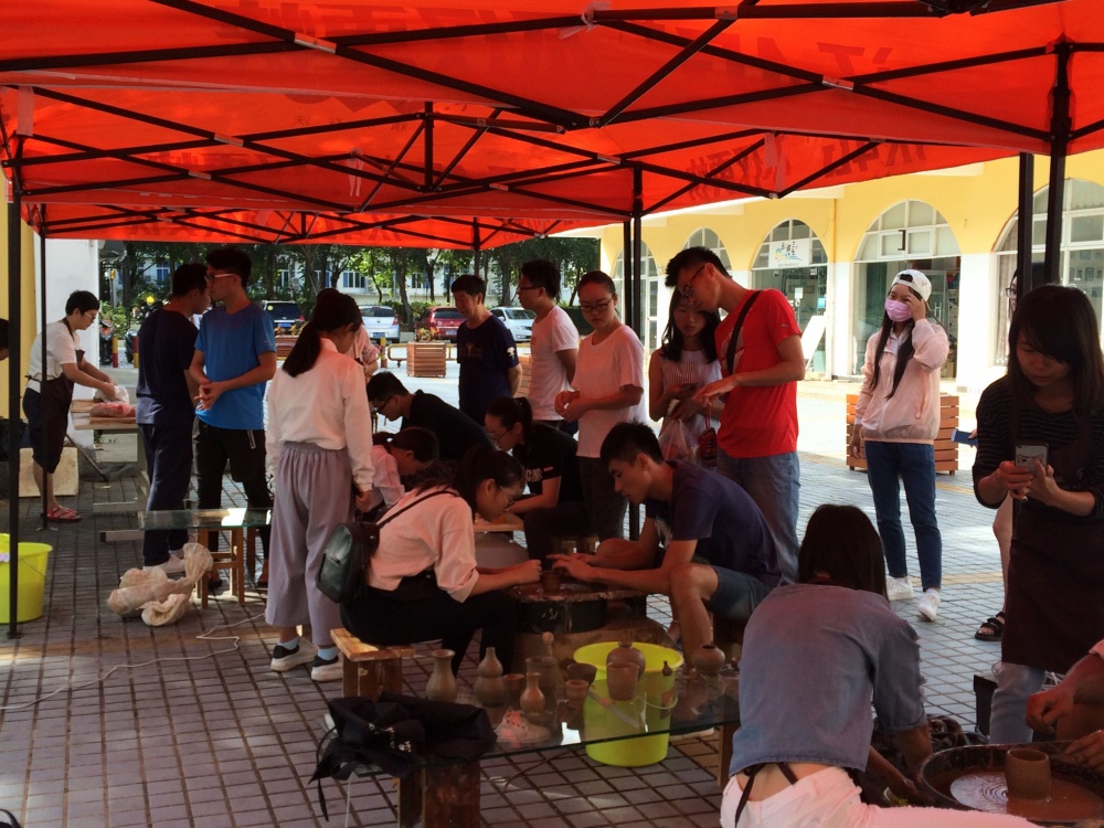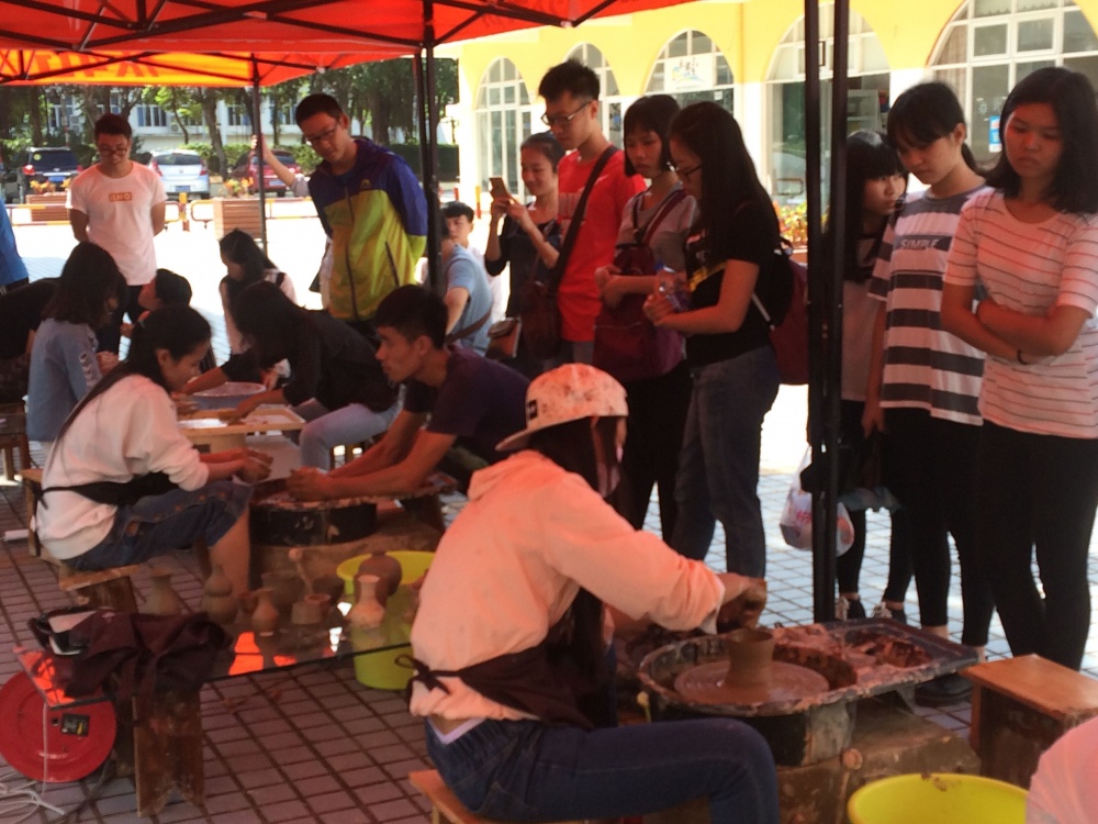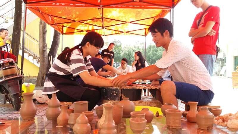 2016年12月25日,艺术学院雕塑专业的师生在北区商业街组织了一次别开生面的陶艺体验活动。正值圣诞节,活动吸引了许多来自不同学院和专业的同学,他们有的拉坯,有的盘泥条,也有的用泥片的成型方法制作各种生动有趣的陶泥小品,有人物、动物和小器件,各种造型、各具特色。一团泥料在表演的工作室的学生手里,瞬间变成了小碗、小杯子和小盘子,现场的观众纷纷称奇,大家都跃跃欲试,想在亲手做一件完全属于自已作品。
