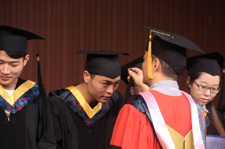 颁发学位证书环节,学长学姐们依次上台,由老师们为他们颁发学位证书,拨正流苏,并合影留念