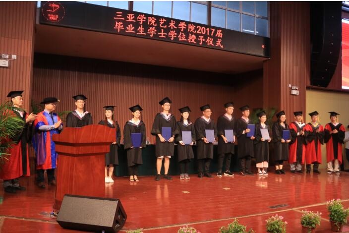 2017年5月21日上午8点,三亚学院艺术学院2017届毕业学位授予仪式在三亚学院东区千人礼堂举行。此次学位授予仪式由张鑫书记主持,出席此次学位授予仪式主要有校党总支副书记沈建勇,艺术学院院长陈博老师,副院长单冰茸老师,院长助理杨丹老师,李明君老师和我院各位教师以及全体毕业生。