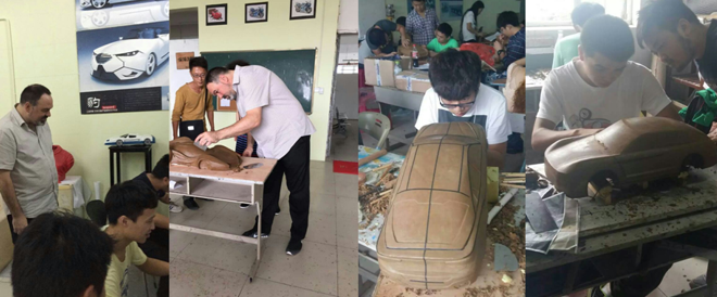 在课堂教学中重抓实践教学,并通过一系列教学措施提高学生实践动手的积极性,鼓励学生相互学习,引导学生拓宽学习渠道,下图吉利汽车设计总监Guy Burgoyne在模型工作室指导学生进行油泥汽车模型制作。