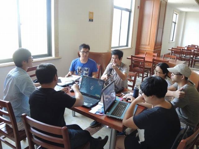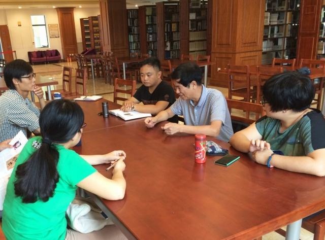 图为李明君教授与青年教师们一起研讨