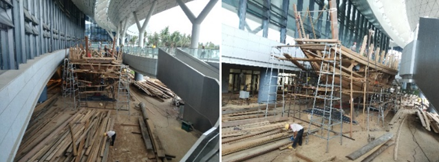 2017年7月24日,我们吾道工作室调研小组来到了潭门镇国家南海博物馆现场进行调研。我们到了之后,受到了古船复原师傅的热情接待,首先,他先带我们参观了国家南海博物馆,师傅介绍,该博物馆建筑面积达70593平米,总投资9.3亿元,工程建设管理采用EPCM模式,何镜堂院士领衔华南理工大学建筑设计研究院主持设计。由于古船复原工作在博物馆内部进行,所以参观博物馆的过程中我们也参观到了正在复原中的古船。古船材质是一种密度很高的木头,这种木材结实,防腐而且很重。