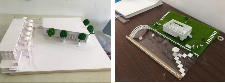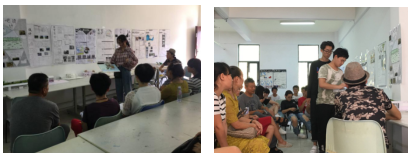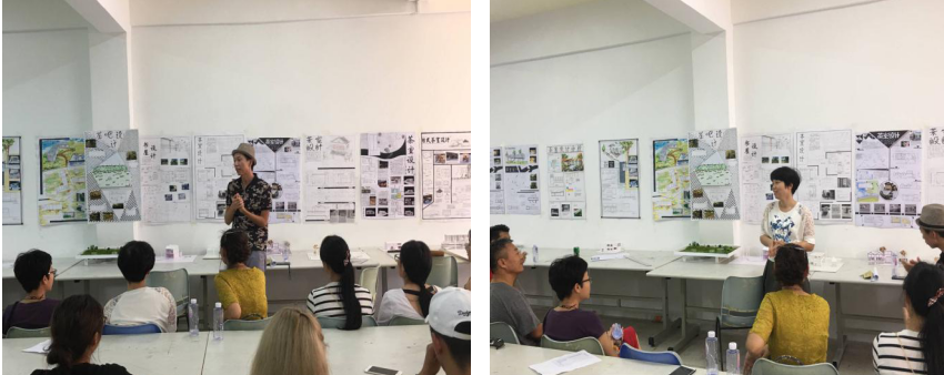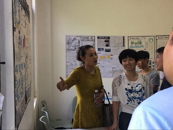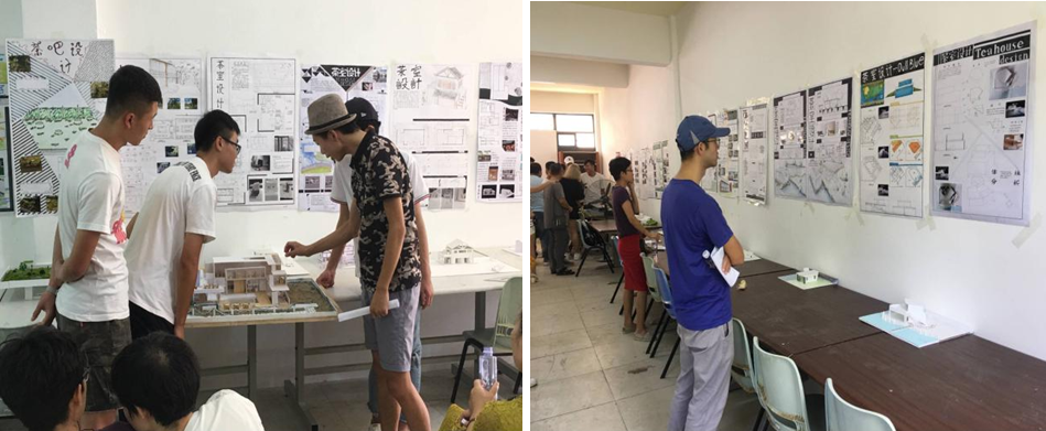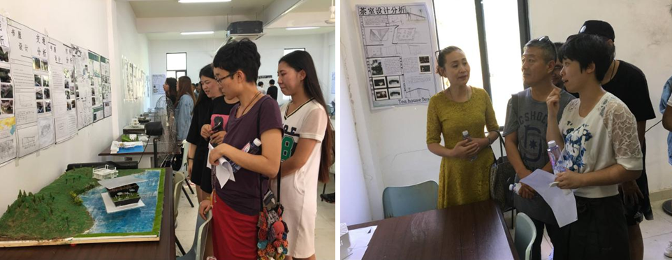 七位老师各自浏览了一下环境设计1603班全班同学的茶室设计分析图及同学们所设计出的建筑模型和展板,对同学们进行点评,指出同学们设计的茶室的优缺点并给予了一些建议。老师与同学们互相讨论交流,非常融洽。