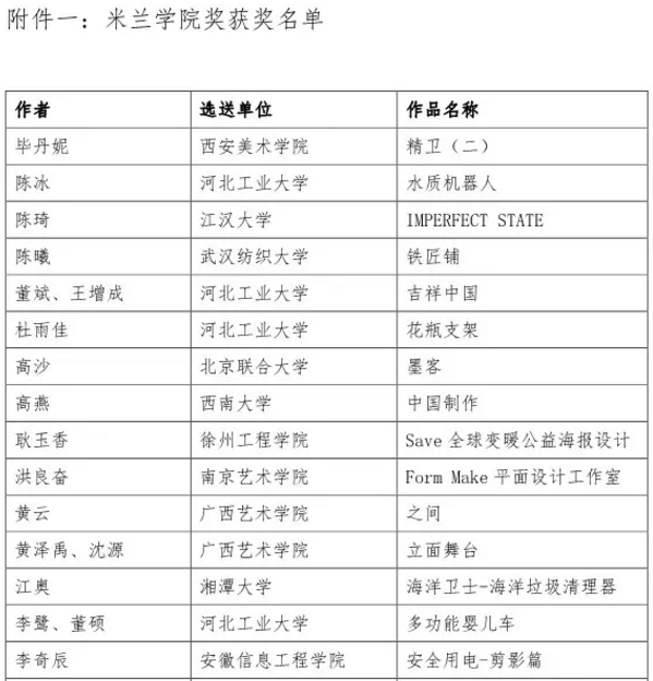 近日,我校艺术学院组织参加由中国教育国际交流协会及同济大学,与米兰设计周组委会、CUMULUS国际艺术、设计与媒体院校联盟联合举办2018米兰设计周-中国高校设计学科师生优秀作品展“米兰学院奖”评选结果公布,中国200余所艺术高校的三千余件设计作品参加评选。本着公平、公正、公开和鼓励参赛的原则,经过初选和终选,评出学院奖45件、优秀奖97件、入围奖161件及优秀组织单位奖50家。