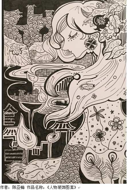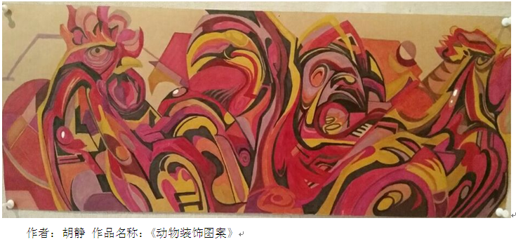 课程在60学时中需要完成装饰图案的创作全过程。课业设置包括黑白装饰图案、色彩综合图案、肌理材料应用装饰、涂鸦装饰、镂空装饰图案;题材包括动物、植物、建筑、人物、数字、字母等。在课程中穿插赛事,通过赛训练实用技能。课程结束之余通过课业展览进行课程总结,系统的串联课程,整合课程内容。在授课手段除常规的多媒体讲解、分组授课、角色互换等,开创手机授课模式。这些设置可以更好传递课程内容,有利于学生们努力学习。