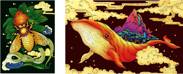 设计中所涉及到的设计图形元素来源于在海南常出现的展翅的白鹭运用手绘的形式绘制出海南常见的或是对海南具有特殊意义的动物,如:“鹿回头”、鲸、白鹭、蜜蜂、蛇。通过线条排列的疏密组成不同的明暗、块面效果,也使其具有更强的装饰效果,丰富画面,使画面看上去更加细腻。在色彩搭配上参考莫比斯的高纯度高明度的色彩搭配,少量的对比色,使画面更加抢眼却不落俗,通过颜