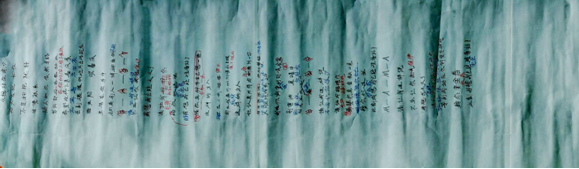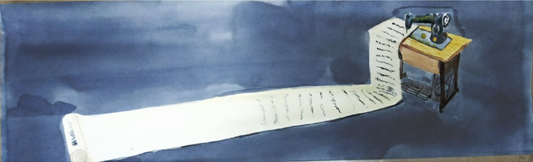 第二件可以把老式缝纫机与布为一个整体,长长的布放在缝纫机上,让人一看到就有一种视觉上的震撼,布上的字则采用第一件作品上的歌词形式黑字,红字,蓝字用黑线,红线,蓝线(图2)。布上的字用老式缝纫机织出来。把第一件作品以更加震撼的形式出现。
