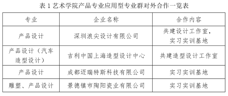 强调学生实践应用能力的培养,在专业群建设的基础上,通过多方面引导,已取得很好的效果。在教学改革和教学安排中,强化课程实践内容和实践课程的建设。在办学过程中通过深化校企合作、产学研结合的创新型改革,与有一定资质的企业建立战略教育合作关系,建立实践教学基地,广泛开展定向式培养、工程实践训练、毕业实习实训、双师型师资队伍建设等合作。目前,通过校企合作的模式,艺术学院应用型专业群已与多家企业建立合作关系,组建了大量合的合作实验室、实习实训基地。表1为艺术学院应用型专业群对外合作情况。