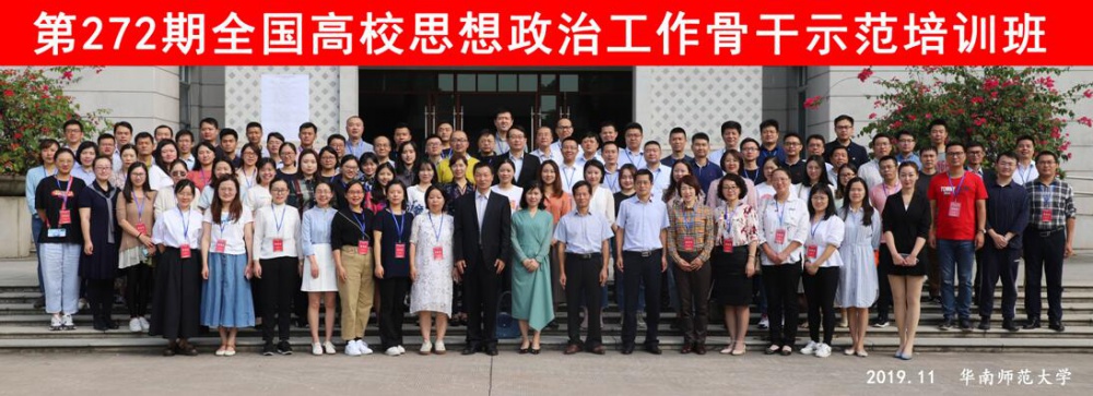 2019年11月1日至4日,第272期全国高校思想政治工作骨干示范培训班在华南师范大学石牌校区研究生院正式开班。2日上午华南师范大学领导和广东省教育厅思想政治工作领导出席开班仪式并致辞,来自全国90多所高校的90多名思想政治工作者参加了培训,我学院孟丽娟受学校委派参加了此次培训班。