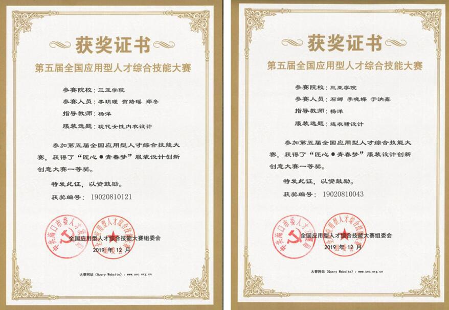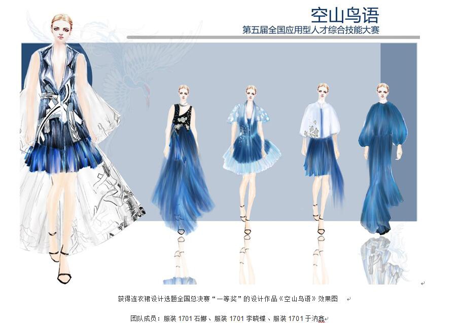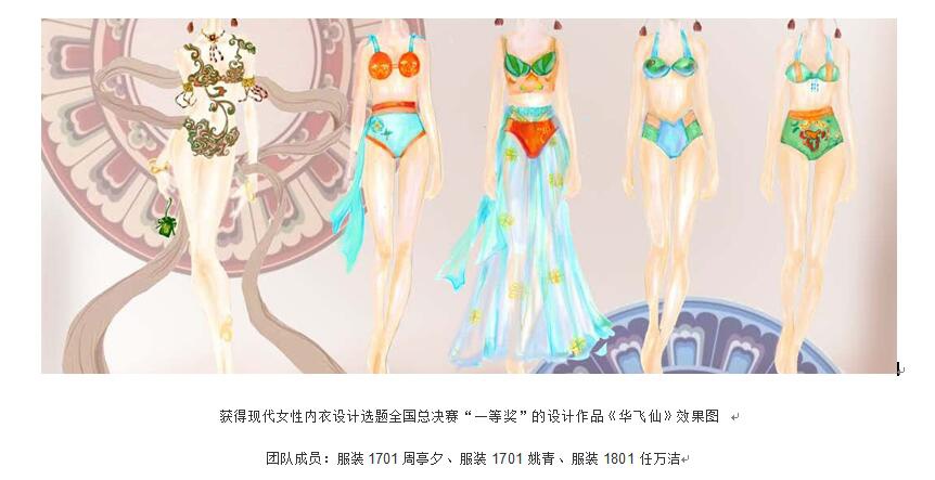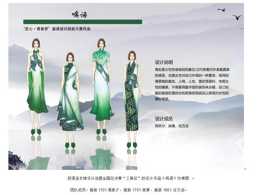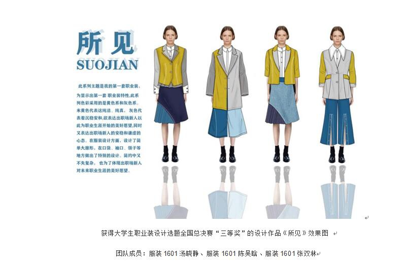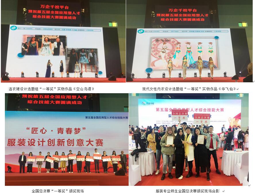 2019第五届全国应用型人才综合技能大赛“匠心•青春梦”服装设计创新创意赛项于今年10月拉开帷幕,以“传承与匠心”为主题,大赛分别以:大学生职业装设计、连衣裙设计、女性现代内衣设计和童装设计四个选题面向全国多所高校征稿。历时3个多月,经过征集设计稿、评选入围作品、入围作品打样等阶段的激烈角逐,我院服装与服饰设计专业学生在大学生职业装设计、连衣裙设计和女性现代内衣设计三个选题中分别有四个参赛团队的设计作品入围,并在最后的全国总决赛中获得《连衣裙设计》选题“一等奖”和“三等奖”,《现代女性内衣设计》选题“一等奖”,《大学生职业装设计》选题“三等奖”。