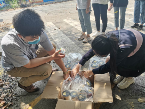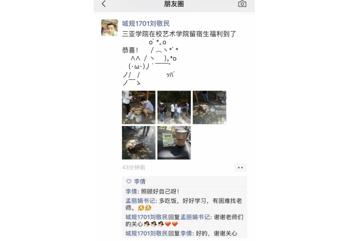 “居然还有维生素片和奶茶,看着老师大汗淋漓的忙碌着,原来我们的直男老师也有这么少女心的一面”。学生在领取奶茶时开心的感叹。在谈到为什么选择维生素片和奶茶时,田希老师说:“学院商量慰问品购买事宜时,我们艺术暨国际设计学院党总支书记张鑫老师要求从学生的实际需求出发,并提出给留宿学生派发善存维生素片的建议,希望防疫期间补充维生素,能让同学们更好的增强抵抗力。几位思想导师也商量着自己花钱请同学们买奶茶,希望可以让留宿的同学们在艰苦抗疫的同时感受到一丝甜和温暖”。