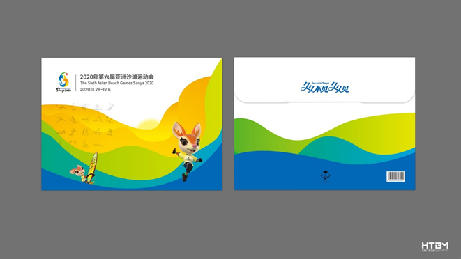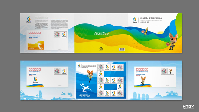 同时,亚沙委发行的亚沙会纪念邮品——《2020年第六届亚洲沙滩运动会》纪念邮折也来自张鑫副教授及其设计团队。纪念邮折,兼顾三亚特色与亚沙元素,封面设计以亚沙会主视觉元素为主,将会徽、口号、体育图标、吉祥物运动造型以不同色彩形式进行结合。内页以淡蓝色与白色的色彩渐变结合,象征三亚的蓝天白云,并用剪影的设计方式融入了三亚元素——崖州古城、鹿回头、天涯海角、凤凰岛、亚特兰蒂斯、免税店……充分展示三亚与亚沙特色。使其具有极高的收藏价值同时传播三亚城市旅游文化,宣扬亚沙会品牌内涵。