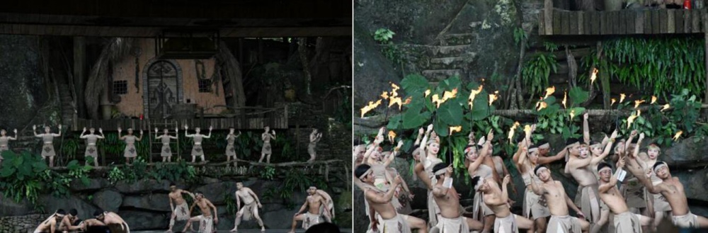 《槟榔·古韵》演出是一个以黎苗族文化为主题的大型原生态实景演出。其中《钻木取火》、《打柴舞》、《织黎锦》、《鼓舞》等节目展现了世界非物质文化遗产的古老魅力,其呈现的少数民族劳作耕耘、人与自然万物和谐共融的原生态奇观、再现了千年史诗般的民族画卷。