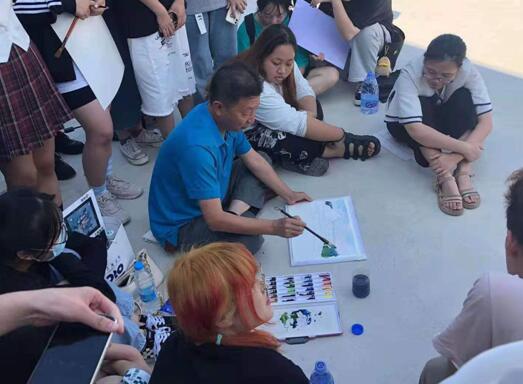起初同学们找到一个最漂亮的建筑和树荫,拿着画笔却不知从何画起,从上到下?从里到外?绞尽脑汁思考平时老师教的技巧。赵老师看到了同学们的担忧与害怕,在现场为大家做了范画。从慢慢的知道该从何画起,到大胆尝试,赵老师一旁指导同学们,并鼓励同学们多感受和多尝试。同学们在创作的过程中一边画一边感叹学校有着这么多自己看不到的美。色彩写生训练,可以很好地激发同学们的绘画激情,有效地强化了专业技能,赵生国教授在给学生讲画、改画的过程中,把对绘画的这份热爱传递给每一位学生,用对艺术的思考引导着学生进入专业的学习中。