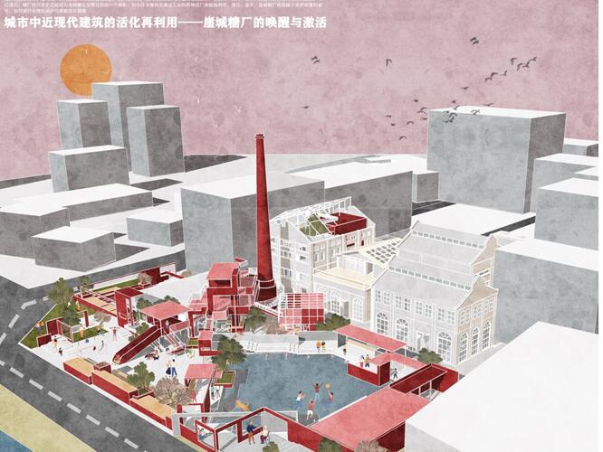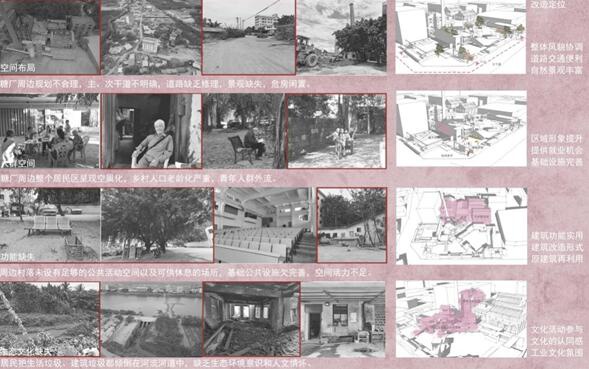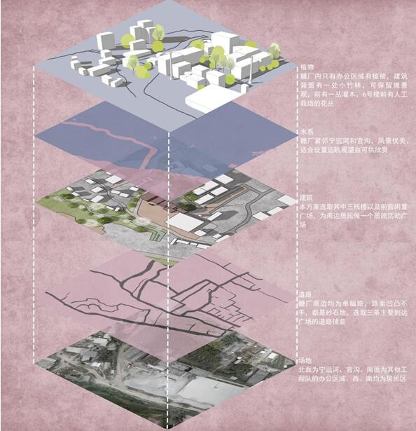 答:整体设计灵感来自中国传统的院落思想,对中国传统园林进行转移,设计运用大量的片墙,通过墙体的穿插与围合,让人们进入广场内,感受到一种游走关系,步移景异,让人们在空间内探索,增加趣味性。:制糖业曾经是海南省经济的主要支柱,而崖城糖厂作为近现代海南工业建筑遗产的典型代表,是崖州区一些村民生产生活的见证,它也曾为整个海南省的发展做出巨大贡献,在建筑、文化、经济和生态等多方面具有深刻意义,时过境迁,糖厂的兴衰史已经成为海南工业建筑发展过程的一个缩影。如今许多曾经发展过工业的用地或厂房面临倒闭、搬迁、废弃,崖城糖厂也因缺少保护而遭到不同程度的破坏,如何进行合理的保护与更新迫在眉睫。基于建筑与环境、建筑与人文、周边村民的需求等为此出发点,对崖城糖厂进行唤醒与激活,设计对旧工业建筑更新,历史文脉的传承作出回应。