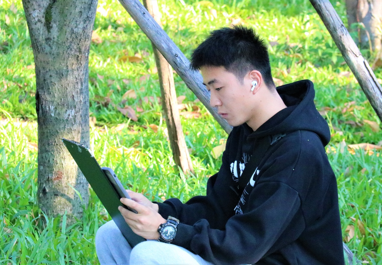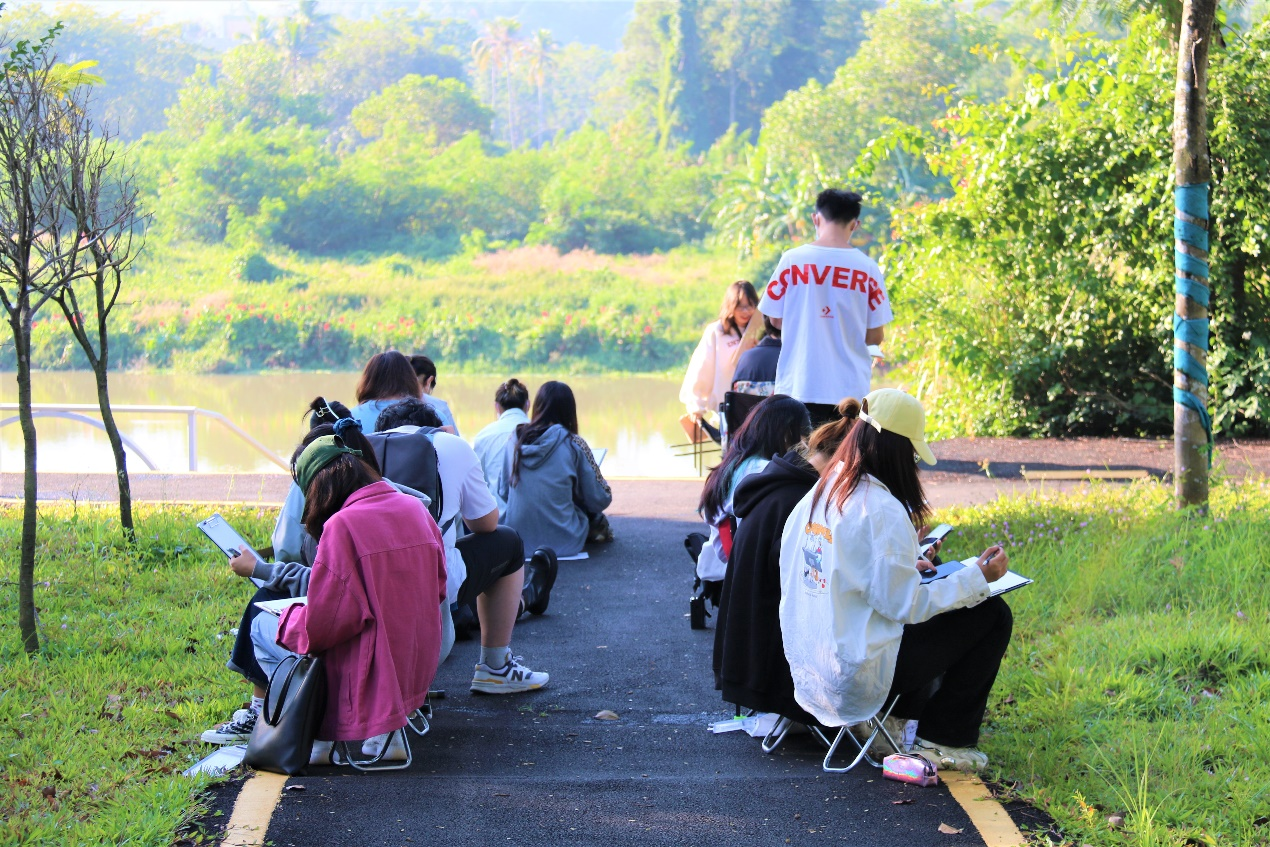 是静谧的湖水、是倒映的的树荫,还是争艳的花草,吸引着同学们的目光。忽而抬头,忽而低头,手中的笔不停地挥动着。