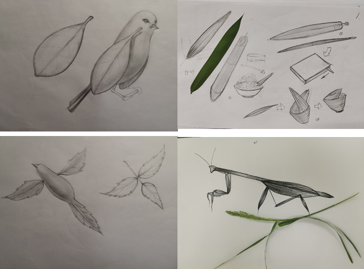 作业一:视觉联想——对树叶的形态进行联想。首先要观察树叶本身形态所具备的特征,