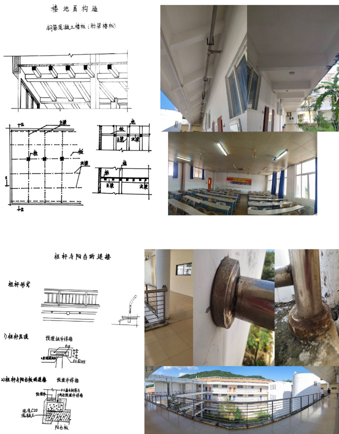 在理论学习的基础上,学生们通过实地调研和测绘开展实践。学生们以小组(4-6人)为单位,在学校图书馆或教学楼现场对建筑物的基本构造进行详细观察分析,并准确地测绘其墙体、楼梯、屋顶、门窗、室内外饰面装修构造与细节,了解建筑结构与施工技术,描绘节点大样图。此外,还包括上网查找相关案例材料,图纸绘制,整理分析,ppt制作汇报等。