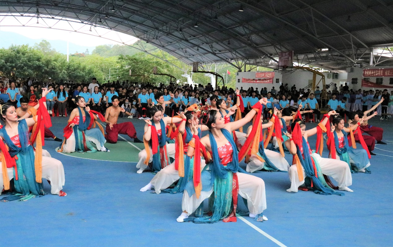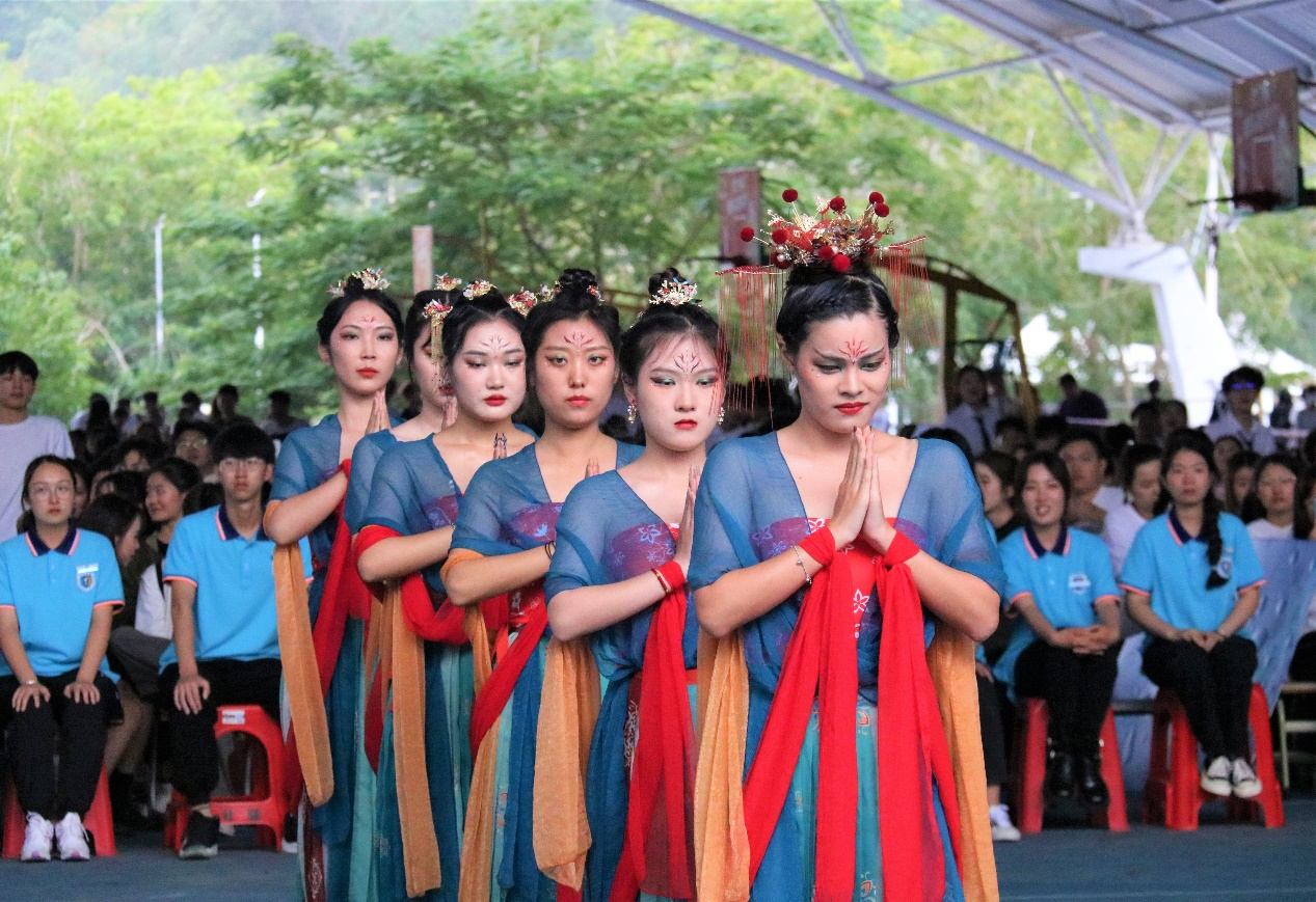 艺术&国际设计学院为第13组出场:比赛开始赛场上奔来一袭红衣,印花雕龙浮舞的少男少女。与日月同辉,与光明共舞。紧接着是敦煌壁画中的飞天神女,和身穿水袖的青年!