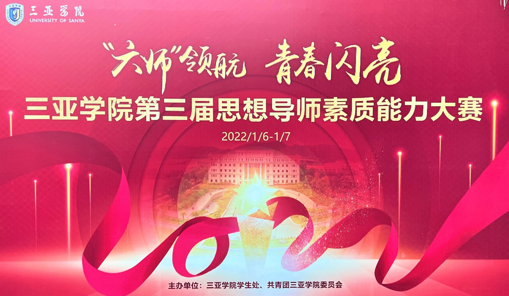 2022年1月6日,我校在书山馆举办了三亚学院第三届思想导师素质能力大赛。比赛历时两天,各个学院23名思想导师同台竞技,三亚学院副校长、学务长高一兰教授致开幕词,希望各位思想导师能有好的发挥。