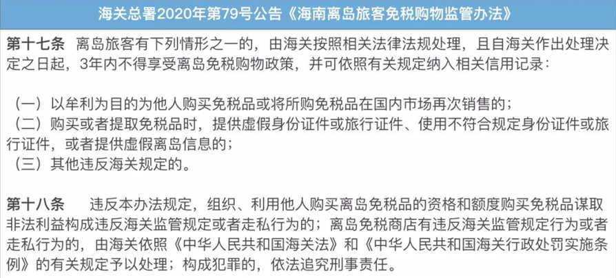 根据离岛免税监管政策规定,离岛免税商品仅限自用,不得用于销售谋利,否则将面临行政处罚,甚至还有可能面临刑事处罚。