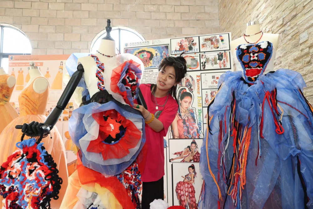 《黎韵》《黎纹》《苗艺》等服装与服饰作品中,毕业生将现代服饰与海南黎苗族等少数民族纹样、染色技艺和服饰相结合,诠释出更符合大众审美穿着的民族服饰。作品《七分之一》灵感来源于新疆哈萨克族的毛毡纹样,以几何花卉为核心素材,将民族特色与现代设计融合,彩融合手工编织技艺,绒和薄纱面料创意结合,时尚感十足。