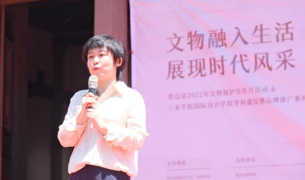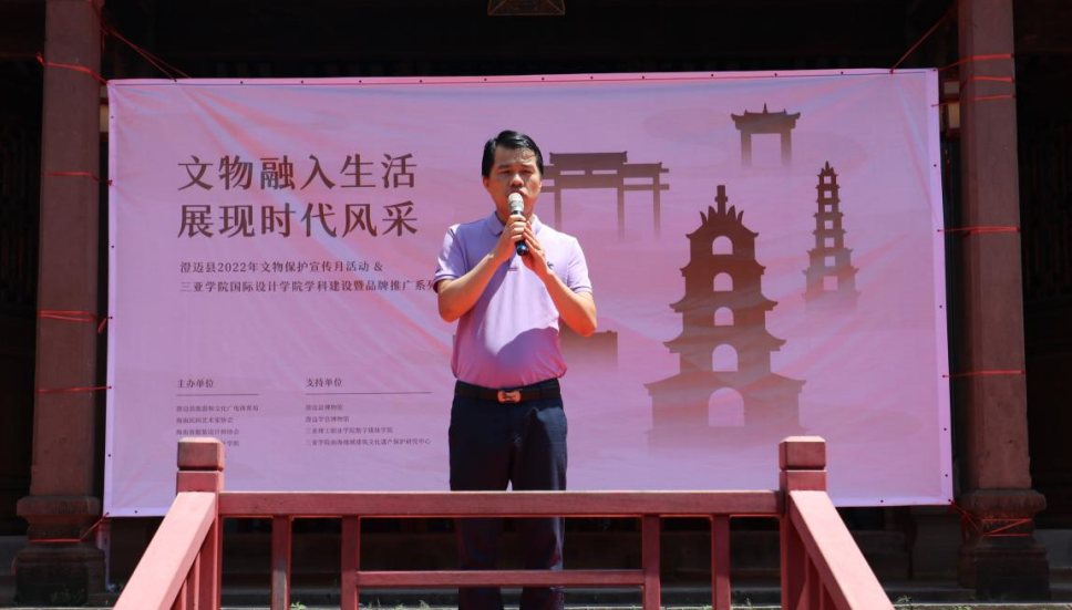 三亚学院国际设计学院常务副院长陈琳致辞,强调澄迈县2022年文物保护宣传月活动&三亚学院国际设计学院学科建设暨品牌推广系列活动涵盖设计文物、绘画文物、走进文物——研学游、文化遗产创意市集、解读文化遗产等多个板块,创意市集。所以整个六月我们都会安排一系列丰富多彩的文化、创意、研学等活动,实现让文物真正的“活起来”,展现我们的时代新风采。在这次活动中不光展现了澄迈县在文物、保护、旅游等方面中做出来的杰出贡献,又可以将三亚学院国际设计学院、艺术学院专业建设成果推广结合起来。此次合作是我们一次全新的、完整的展现,希望今后这种合作与交流能更多起来,让我们学校的设计成果能更多的服务于乡村振兴、实现真正让文物“活起来”。