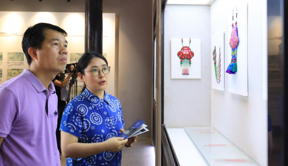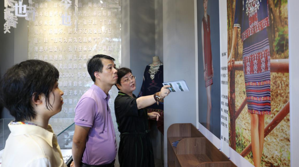 开幕式后,与会嘉宾签名合影,进行展览参观,此次展览围绕“设计文物”这一主题,主要体现了四个方面的内容,分别是“锦绣黎尚”、“绣的再造”、“焕然新生”、“静由慢生”,展览形式丰富,展品极具地方特色,既有色彩绚丽的黎族元素服装设计和精细巧妙的刺绣文创饰品设计,还有建筑规划和澄迈石石矍村古建筑群模型展示等,内容丰富,形式多样,受到了参观者的一致好评。