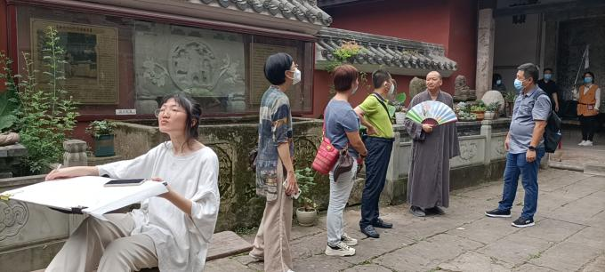 22日上午,在华岩寺法师源中的带领下,一行人对华岩寺的露天金佛、华岩洞、七步荷塘、华岩佛教博物馆、华岩寺的艺术培训中心等进行了调研。