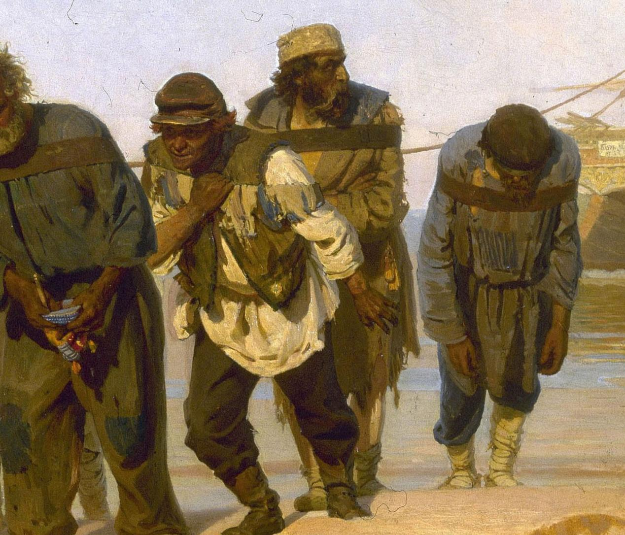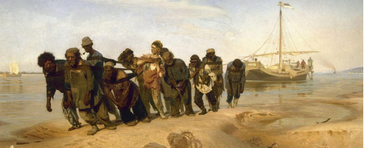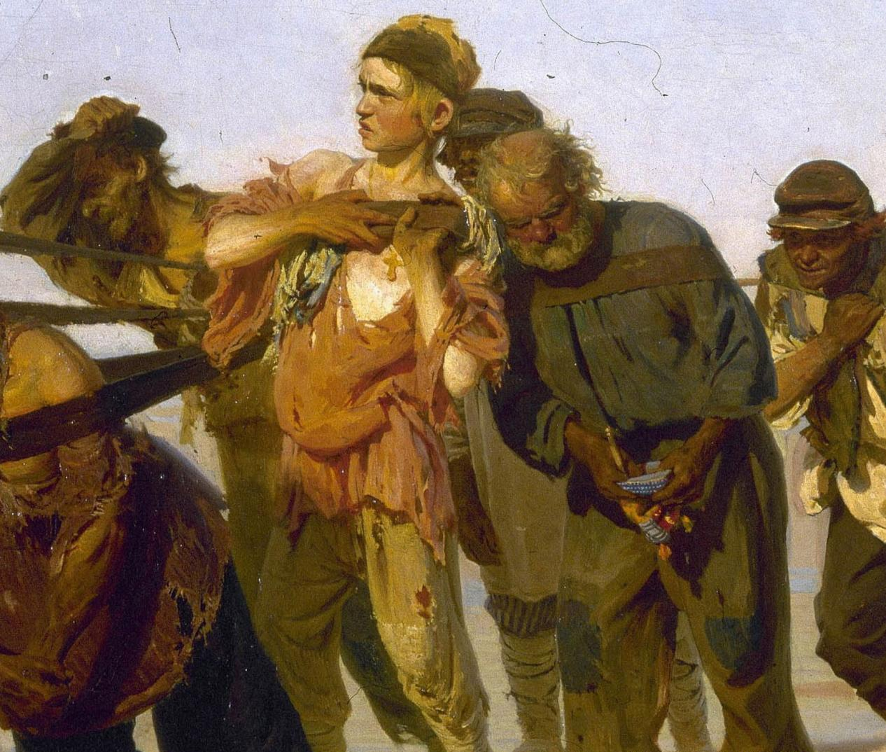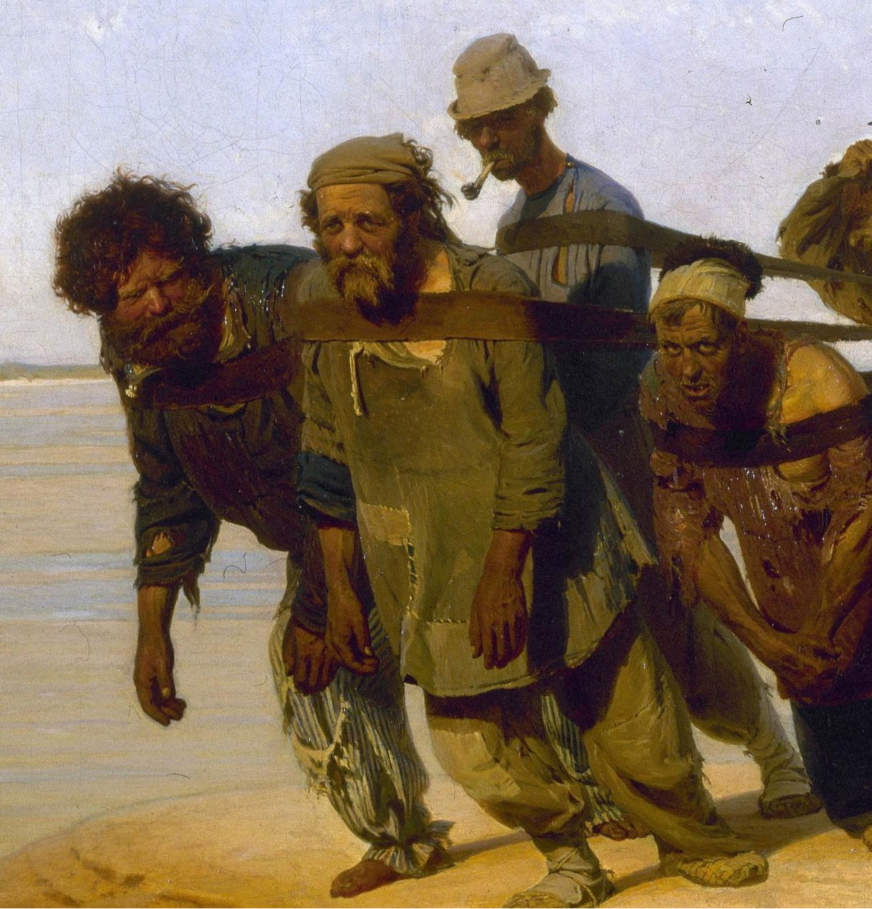 宽广的伏尔加河上,一群拉着重载货船的纤夫在河岸艰难地行进着。正值夏日的中午,闷热笼罩着大地,一根破缆绳把纤夫们连接在一起,他们哼着低沉的号子,默默地向前缓行。有农民、退伍军人、神父等。背景运用的颜色昏暗迷蒙,空间空旷奇特,给人以惆怅、孤苦、切实深入到纤夫的心灵深处真实的写照, 被烈日炙烤的河岸上,一队蓬头垢面、衣衫褴褛的纤夫拖着沉重的脚步拉着货船,在酷日下精疲力竭的向前挣扎。他们中有老有少,个个都衣着破烂、面容憔悴。领头的是一位胡须斑白的老者,走在最后的纤夫低着头垂着手,麻木地随着队伍向前挪动,画面中部有一位少年,可以看出他才开始这样的工作不久,皱着眉头还不太习惯,他直起腰想用手松一松肩头紧勒的纤绳,毕竟年轻,还不甘心忍受这样的苦楚。其余的人都弯着腰低着头,似乎已没有多余的力气再来表现点什么。