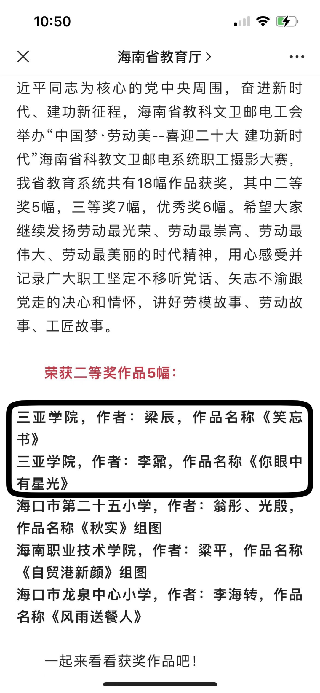 在刚结束的“中国梦·劳动美--喜迎二十大 建功新时代”海南省科教文卫邮电系统职工摄影大赛中,我院梁辰老师的作品《笑忘书》荣获二等奖由海南省教育厅官微上进行公布。 本次活动由海南省教科文卫邮电工会举办,为喜迎中国共产党第二十次全国代表大会胜利召开,充分展示党的十八大以来党和国家事业取得的历史性成就、发生的历史性变革,激励亿万职工更加紧密地团结在以习近平同志为核心的党中央周围,奋进新时代、建功新征程而举办的活动。海南省教育系统共有18幅作品获奖,其中二等奖5幅,三等奖7幅,优秀奖6幅。
